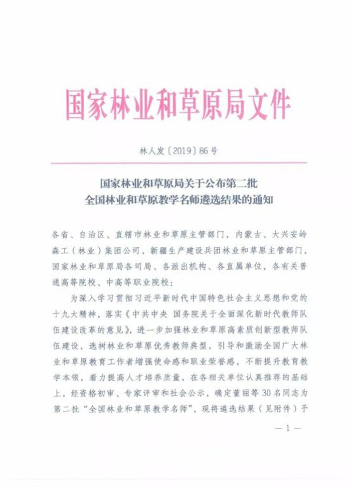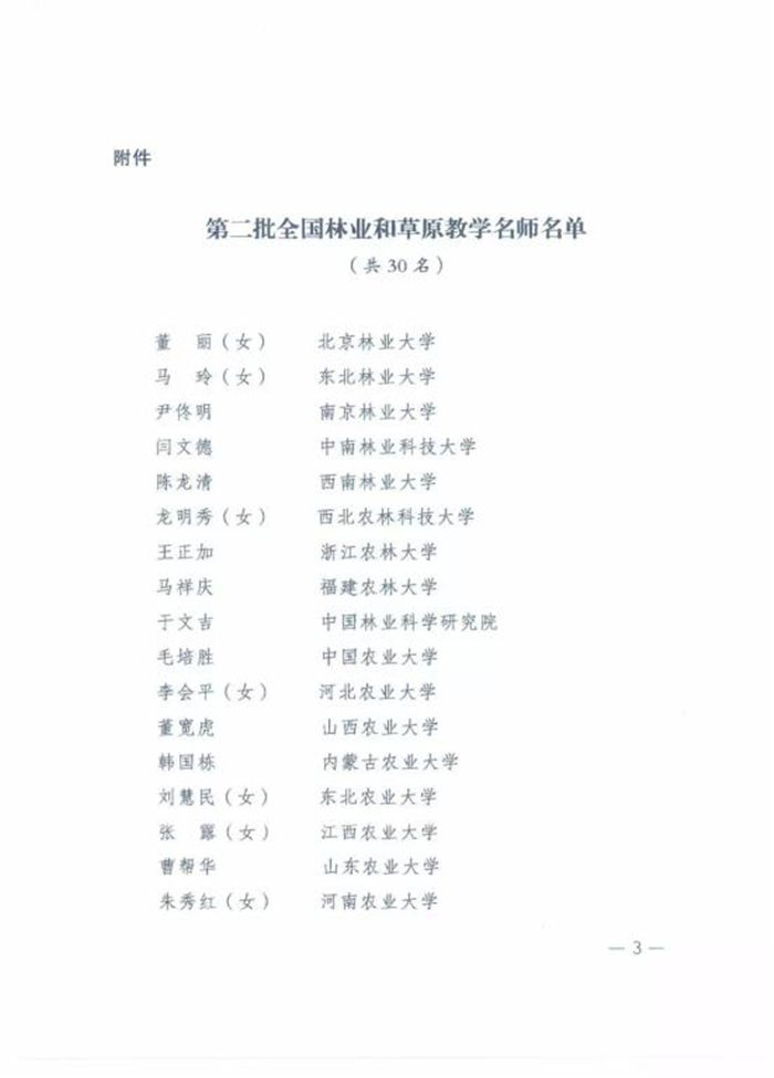 此次评选全国林业和草原教学名师,是为了进一步加强林业和草原高素质创新型教师队伍建设,选树林业和草原优秀教师典型,引领和激励全国广大林业和草原教育工作者增强使命感和职业荣誉感,不断提升教育教学本领,着力提高人才培养质量。遴选工作每2年开展一次,面向全国有关涉林草普通高等院校、中高等职业院校、林业和草原科研单位承担涉林草相关学科专业教学任务的在职在岗一线专任教师进行,经资格初审、专家评审核社会公示,最终确定30名同志为全国林业和草原教学名师。其中,普通高等院校(含培养研究生的科研单位)20名,中高等职业院校10名。