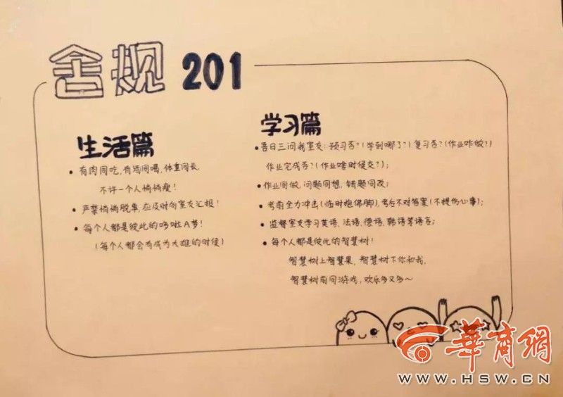 四位小花从进宿舍就一起制定了舍规,贴在寝室门后。日常提醒是“预习否?复习否?作业完成否?”群相册一半是学习资料,一半是宿舍照片。
