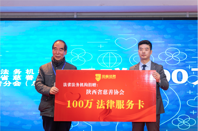 在会议高潮,法雀法务机构为陕西省慈善协会捐赠了2020年至2025年为期五年、每年20万,共计的100万法律服务卡。现场掌声欢呼声不断。
