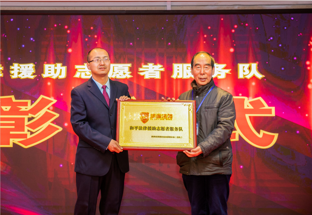 陕西省慈善协会副会长、陕西省慈善协会志愿者分会(总队)队长孙忠信为和平法律志愿者服务队授牌。