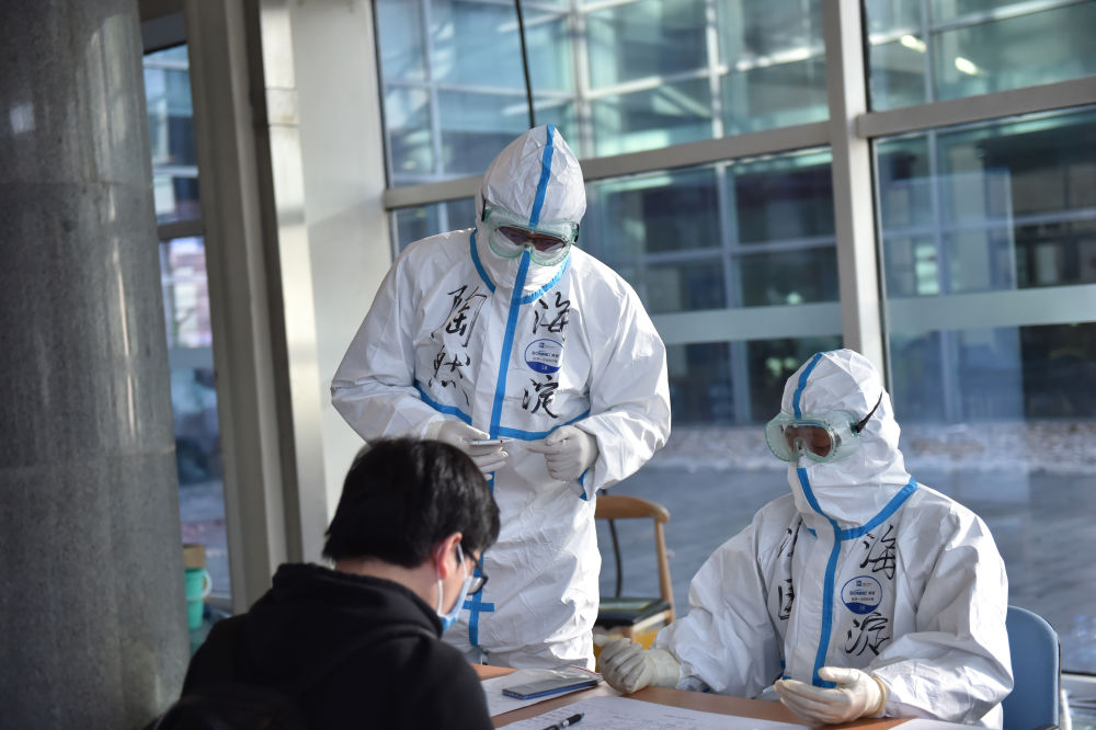 3月14日,北京市海淀区集散点工作人员在询问入境人员信息。近日,北京市启用新国展作为首都机场全部国际及港澳台地区入境旅客的转运集散地,此集散地用于经机场检疫后未出现发热、咳嗽等症状的低风险人群临时集散。新华社发(陈钟昊摄)