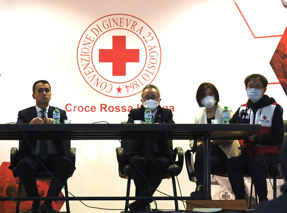 3月13日,在意大利首都罗马,意大利外长迪马约(左一)与中国抗疫医疗专家组成员(右一)出席新闻发布会。新华社发(阿尔贝托·林格利亚摄)