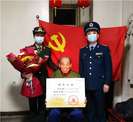 3月18日,陕西省军区西安第十一干休所长韩军科、政委郭丽莉带着鲜花和捐款收据,送去他们对老首长、老阿姨在抗击新型冠状病毒中献出爱心的敬意和谢意。