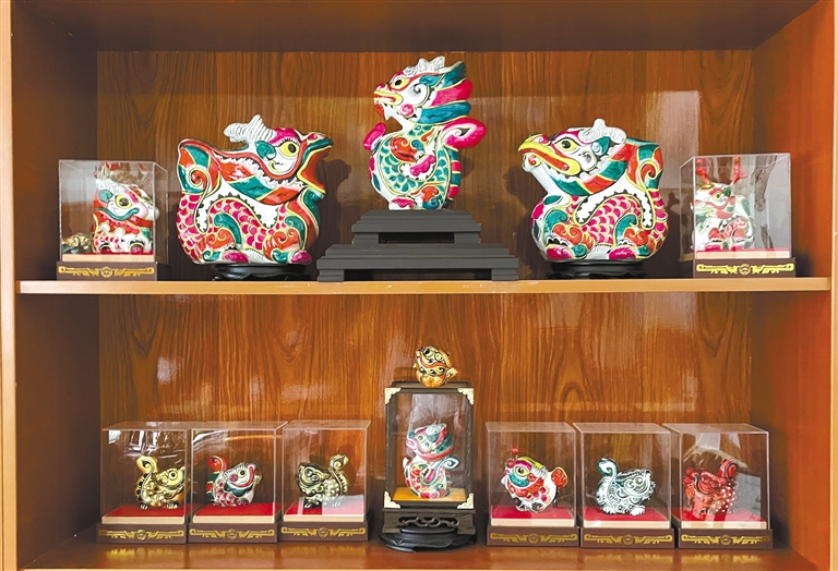 胡锦伟还根据文献记载和神话传说,制作出“龙九子”造型的泥塑作品。比如长着牛角的囚牛、口含刀斧的睚眦、蹲坐远眺的嘲风、形似狮子的狻猊,面庞似虎的狴犴……它们的形象尽可能地贴合了古籍记载和人们的认知,同时又符合现代人的审美,生动可爱。