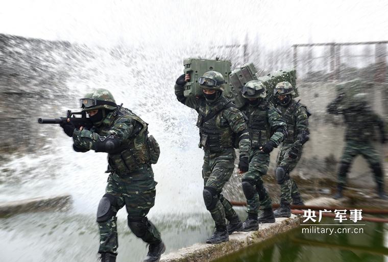 运送弹药的特战队员在掩护下穿越水障。