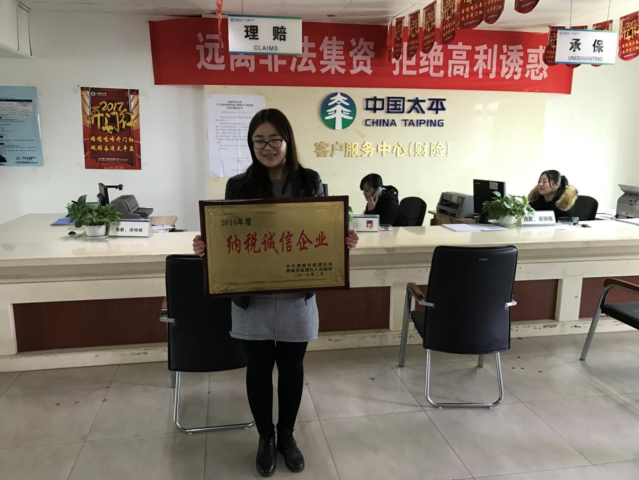 2月,喜讯传来。太平财产保险有限公司渭南市分公司被中共渭南市临渭区委和渭南市临渭区人民政府共同授予“2016年度纳税诚信企业”称号。