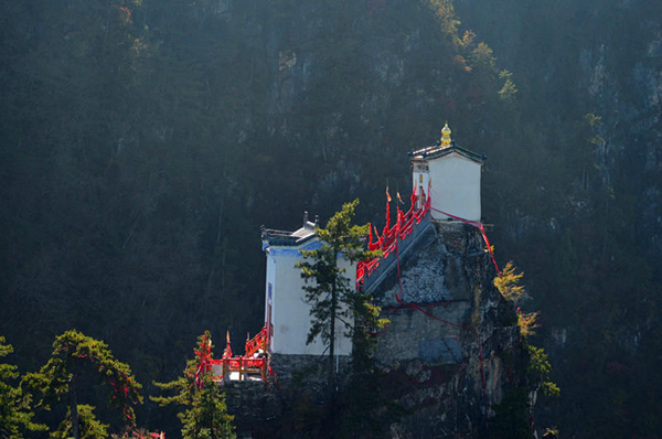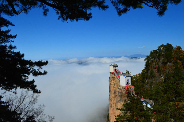 塔云山,又名讨儿山,邑人进士晏安澜改今名,其道教古建筑群建于明正德年间(1505—1521),由一馆、一塔、一庙、一堂、九殿组成,风格古朴而清雅。尤其金顶观音殿,建于塔云山万仞绝顶之上,三面悬于万丈深渊,可谓鬼斧神工,令人叹为观止,被称为“秦楚一柱,绝顶道观”。“金顶旋转在九霄,脚踩飞云魂飘渺。果是人间一仙界,天宫胜景独这好。”这昔日志士名人咏诗赞誉的,就是位于镇安县之西的柴坪镇安坪村的塔云山奇观。