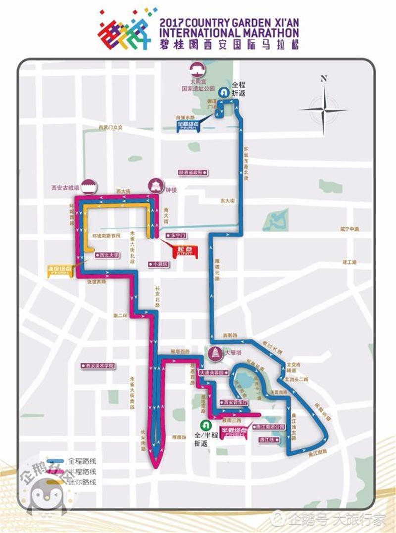 赛道途经钟楼、西大街、西北大学、小寨、大雁塔、大唐芙蓉园、大明宫遗址公园等西安著名景点、高校及商圈。迷你马拉松项目终点设在西北大学西门内广场,半程马拉松项目终点设在曲江南湖公园,马拉松项目终点设在大明宫国家遗址公园御道广场。