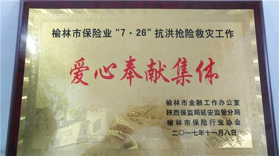 此次受表彰的抗洪救灾先进集体有6家、先进个人有21名,爱心奉献集体5家、爱心奉献特别贡献2个。太平财险榆林市分公司获“爱心奉献集体”表彰奖励,助理总经理陈蒲萍被评为“先进个人”。在7.26抗洪抢险中,太平财险理赔查勘人员枕戈待旦,攻坚克难,急客户之所急,想客户之所想。他们不顾自身安危,深入灾区开展查勘理赔工作;饿了来包泡面、渴了喝瓶矿泉水;双眼熬红了,腰身累弯了,这些又有何妨?使命使然,职责所在。他们所思所想就是要把太平财险的关爱送到每名客户的和需要救助人员身边,真正做到了“快理赔”和“宽赔付”,截止目前累计赔付金额176.84万元。