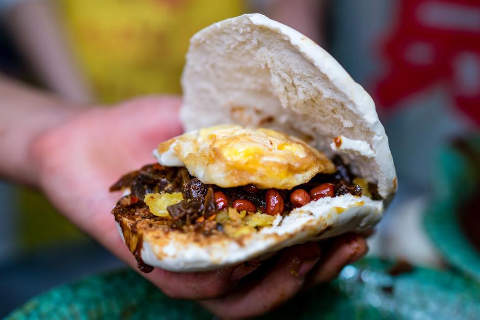 花生豆脆脆的,鸡蛋还是煎的,把爱吃的都夹进一个馍里,津津有味很是满足!