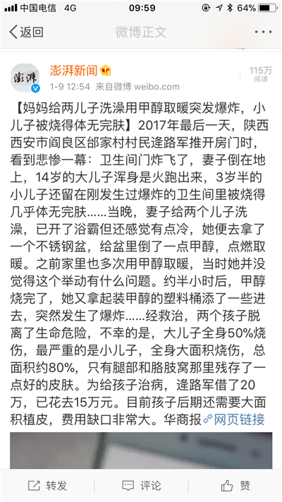 最近一则让人心酸的新闻“西安阎良妈妈给两儿子洗澡用甲醇取暖突发爆炸,小儿子被烧得体无完肤”被各大媒体报道,网友争相转发。