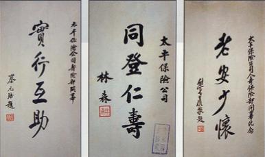 1934年4月,太平水火保险在以“唤起国人合力,以期挽利权”为目的创办的5年后,决定去掉公司名字中的“水火”二字,添办人寿保险业务,并施行会计独立核算。而就在人寿部营业当天,社会名流纷纷来到公司贺喜,并因此有多份墨宝传世,其中一份便出自原北京大学校长蔡元培先生之手,上书“实行互助”。所谓“互助”,意指保险具有社会“稳定器”的作用,对社会互助事业的发展大有裨益。