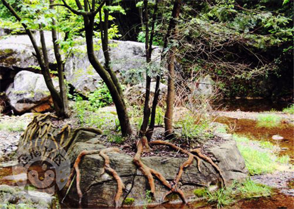 距峡口三公里,两块五吨大小的巨石上生长着两棵树,其中较粗的一棵树是名贵植物金钱槭,国家重点保护树种;较细的那颗名叫毛紫薇。两棵树根生扎于坚石之中,傲然屹立。