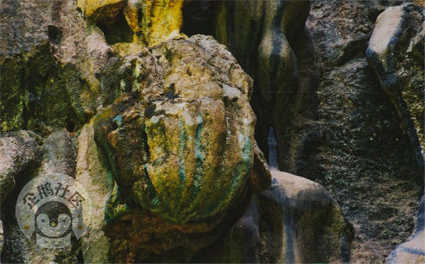 白龙湖对岸的岩壁中间悬着一颗形似“金瓜”的顽石,石上可以隐隐约约看到黄绿相间的瓜纹。