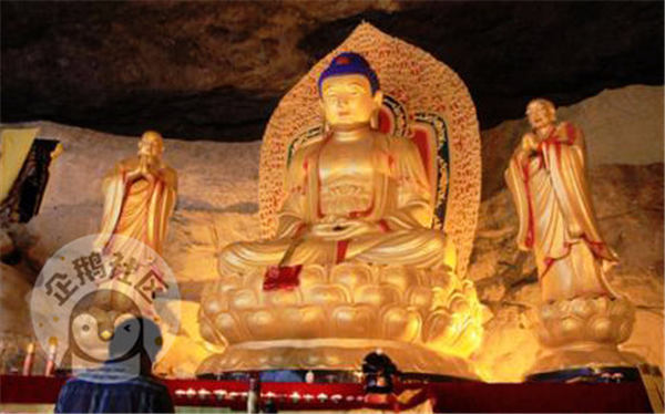 金狮洞外谷底深潭边的石壁上,有一弥勒佛像,藏于浓密的草木间。