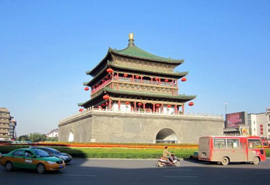 西安钟鼓楼广场位于东西南北四条大街的交汇处,广场东侧屹立着已有六百多年历史的钟楼,西侧屹立目前所存在全国最大的鼓楼。钟鼓楼广场建于上世纪90年代末期,始建之初将建于两楼之间的杂乱建筑拆除,使从前很难相见的钟楼和鼓楼“相见尽欢颜”,成为了西安市一大景观。