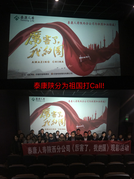 泰康人寿陕西分公司本次组织员工包场观看《厉害了,我的国》纪录片,就是为了深化公司全体员工对习近平新时代中国特色社会主义思想内涵的理解认识,坚定大家爱党护党拥党敬党的决心意志,点燃中国心、唤醒骄傲感,引导大家自觉将对党、国家和民族的感情热情转化为立足岗位实践、投身保险行业建设的强大动力,为实现中华民族伟大复兴的中国梦不断前行奋斗。