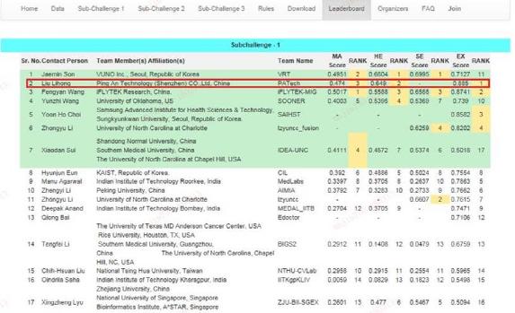 近日,在国际医学影像顶级会议ISBI举办的IDRiD眼底图分析竞赛中,中国平安集团旗下平安科技的平安颖像平台表现优异,斩获硬性渗出物(EX)分割任务世界第一,出血(HE)分割任务世界第二,以及微动脉瘤(MA)分割任务世界第三的好成绩。这是继平安颖像平台在国际医学影像领域权威评测LUNA排行榜获得世界第一后,再次获得世界级大奖。