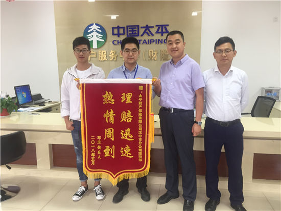 5月8日下午,饶先生专程来到太平财险汉中市分公司送来锦旗——“热情周到,理赔迅速”,简简单单的几个字是对太平财险汉中市公司工作成果最大的认可。绕先生表示,他对太平财险的快速理赔与服务态度非常满意,以后会继续支持太平财险。