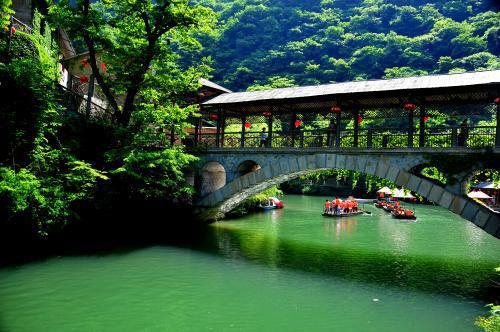 和别的避暑地不同,作为国家5A级景区,这里显得很清静,游客不会特别拥挤,周围是郁郁葱葱的树林,弯曲的河水围绕着整个景区,一看就凉快。