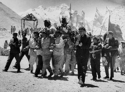1960年5月30日,王富洲等3人回到大本营受到热烈欢迎。