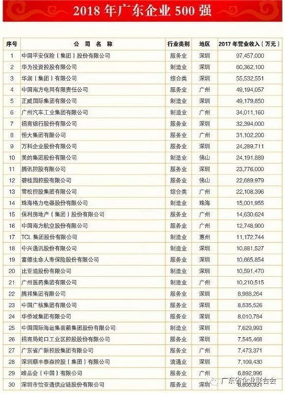 2018年广东企业500强榜单由广东省企业联合会、广东省企业家协会联合发布,是在各级经信部门、企联系统、行业协会的大力支持下,参照国际上通行做法,以2017年企业营业收入为基本标准,综合参考企业的其他经营指标,经专家委员会审定后推出。