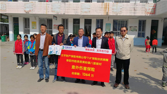在2018年“7.8全国保险公众宣传日”活动期间,太平财险主动认捐了安徽省的2个公益扶贫项目,这也是太平财险继2017年向上海市550名贫困养老护理员捐赠意外伤害保险以来,再次响应中国保险行业协会的号召认捐并落地扶贫捐赠项目。为做好此次项目落地实施工作,太平财险充分调研了安徽省贫困地区的需求,了解到临泉县八里坡村、六安市裕安区韩摆渡镇王桥村村民生产生活条件艰苦,留守人员多为老弱病残人群,抵御风险能力差。其中,八里坡村小唐营小学的学生群体也多为留守儿童,日常得到的关怀少之又少。针对上述困难,太平财险制定了完善的保险方案,通过保险捐赠的形式为在校师生和贫困户撑起“保险伞”,实现了对莘莘学子的呵护,有效缓解了贫困人口因灾、因残增贫和返贫的困境。