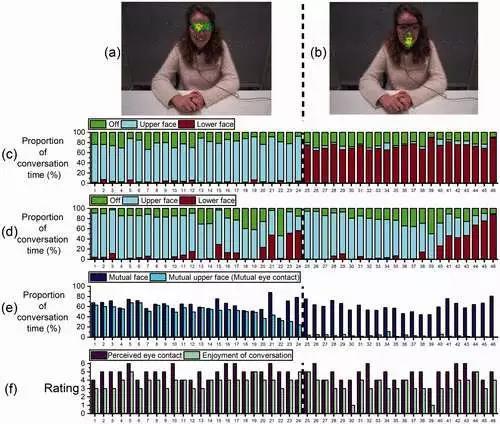 实验结束后,志愿者们根据自己的主观感受,对谈话的目光接触频率(0 代表“从不”,6 代表“一直”)和愉悦程度(0 代表“很差”,5 代表“非常好”)打分。结果显示,“看眼组”打出的分数是 4.96 和 3.79,“看嘴组”则是 4.78 和 3.36,虽然还有一点差距,但总体而言两拨人给出的反馈相当接近。