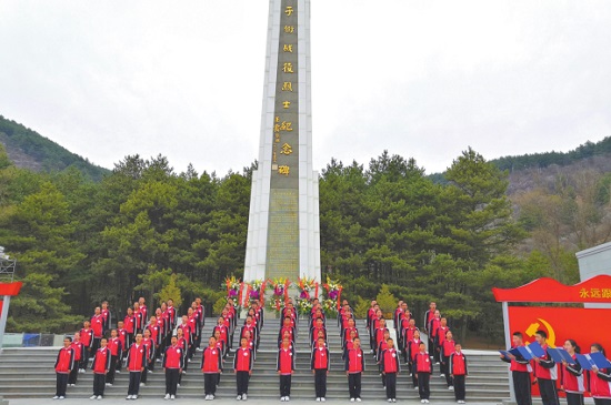 4月3日,宜川中学第九届“青春励志行”红色研学活动祭奠英烈仪式在瓦子街战役烈士陵园举行。12时,全体师生齐唱国歌,学生代表向烈士们敬献花篮。