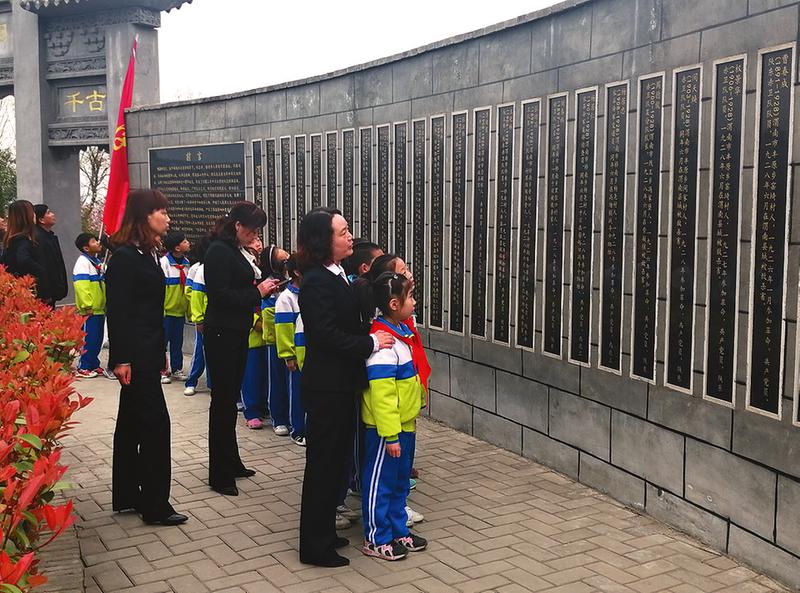 4月2日,渭南市大荔县学门前小学师生代表瞻仰刻有烈士姓名的墙壁。 陕西日报记者 仵永杰摄