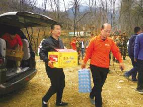印台区王石凹镇陈家河小学1979级学生在铜川聚会时,听闻火情,驾车3个多小时赶到陈家山,为救援队伍送来了牛肉、矿泉水、馒头和咸菜。
