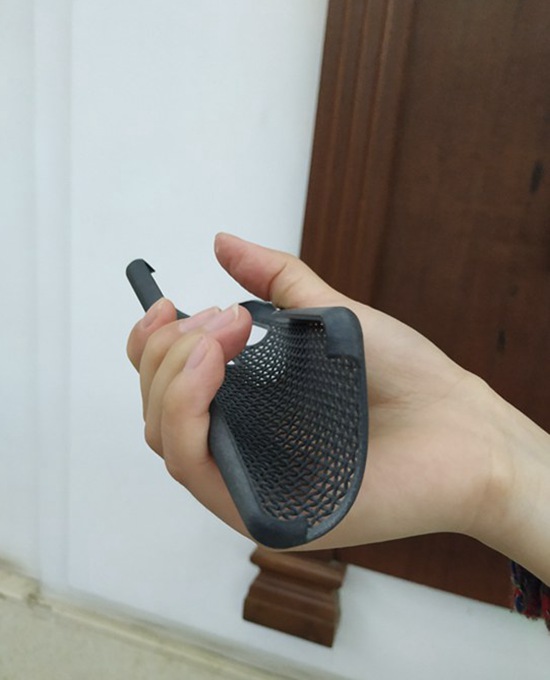“最初我们从手机壳开始,我们用不同材料做了一些很有设计感的手机壳,例如我手里拿的这个手机壳,就是3D打印出来的,用的是航天尼龙材料,整个手机壳的重量不到10克,这种材料韧性非常好,不怕摔,能有效保护手机。”屈盼婷说。