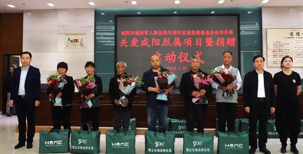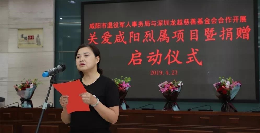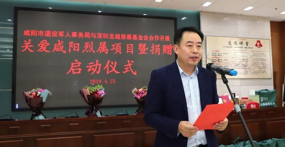 4月23日下午,咸阳市退役军人事务局联合深圳龙越慈善基金会举行关爱咸阳烈属项目暨捐赠启动仪式。市退役军人事务局局长李忠祥、市邮储银行行长强波民,原市双拥办副主任池勇,市邮储银行营业部主任刘滨,兴平市志愿者应急救援队秘书长刘文娥,部分烈士家属代表和市退役军人事务局机关全体干部职工及局属单位代表参加,市退役军人事务局副局长李智敏主持仪式。