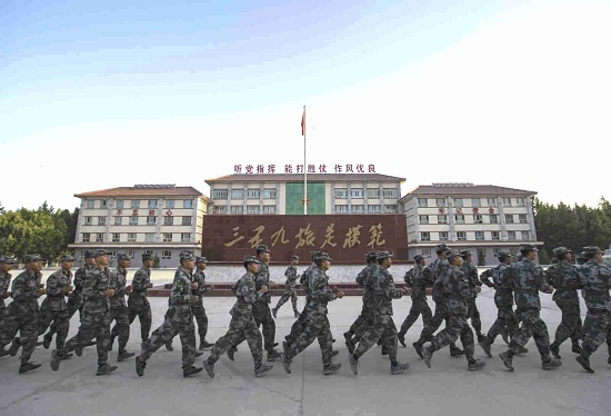 5月31日,新疆军区某红军团的战士从营区主楼前的团史碑旁边跑过。 记者 赵晨摄