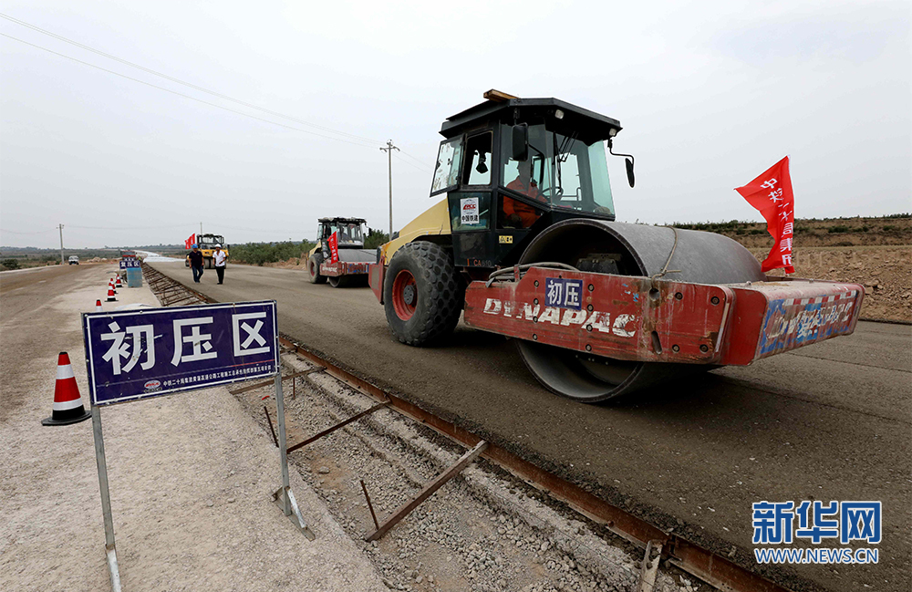 7月8日,工人们在对路基水稳层进行初压。