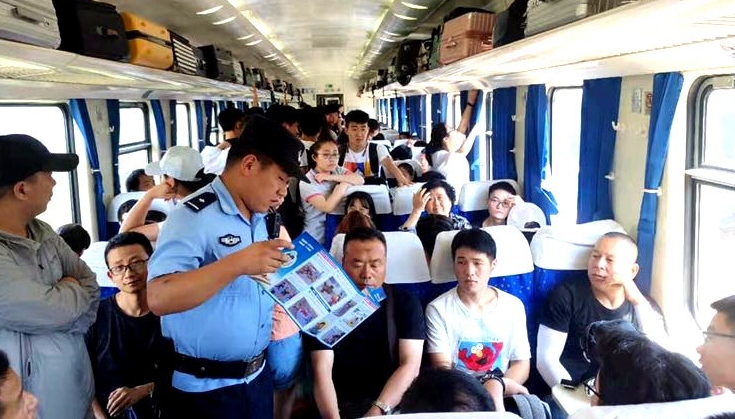 在全国铁路公安机关开展的“平安站车路、金盾护你行”专项行动中,西安铁路公安处西安、宝鸡乘警支队进一步加强车厢内巡视和治安防范力度,并组织乘警、安全员深入值乘的列车车厢内开展治安、消防及反恐等安全宣传教育活动。 7月11日,民警们为广大旅客面对面地讲解旅途安全常识,并在车厢内与旅客积极互动,发放相关宣传手册。旅客蔡先生接过乘警发放的安全宣传手册,一边认真阅读一边踊跃提问,乘警都耐心地一一解答。蔡先生表示,通过此次旅途,使他进一步提高了旅途防范安全意识。(记者 周雨馨 通讯员 刘卫国 康超 李振江)