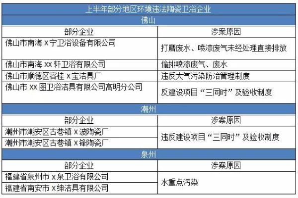 上半年,卫浴产区佛山、潮州、泉州等地的多家卫浴企业因涉嫌环境违法行为被立案调查。佛山有四家卫浴企业因环境违法行为被立案调查,其中佛山市顺德区容桂X宝洁具厂因违反大气污染防治管理制度,被责令停止违法行为并罚款17.5万元。潮州方面,有两家陶瓷厂因违反建设项目“三同时”及验收制度,各被处以3万元的罚款。而泉州市生态环境局公布的重点排污单位名录中,也有两家卫浴企业被列入。