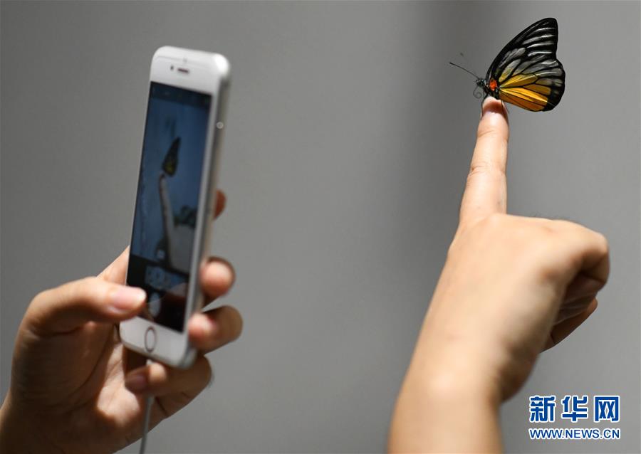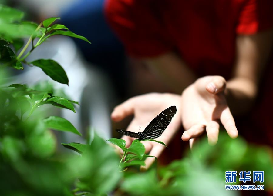 7月14日,参观者与一只蝴蝶亲密接触。新华社记者 李一博 摄
