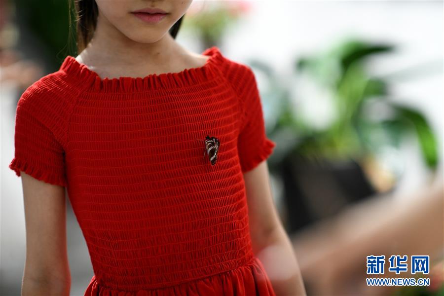 7月14日,一只蝴蝶停在一位小朋友的衣服上。新华社记者 李一博 摄