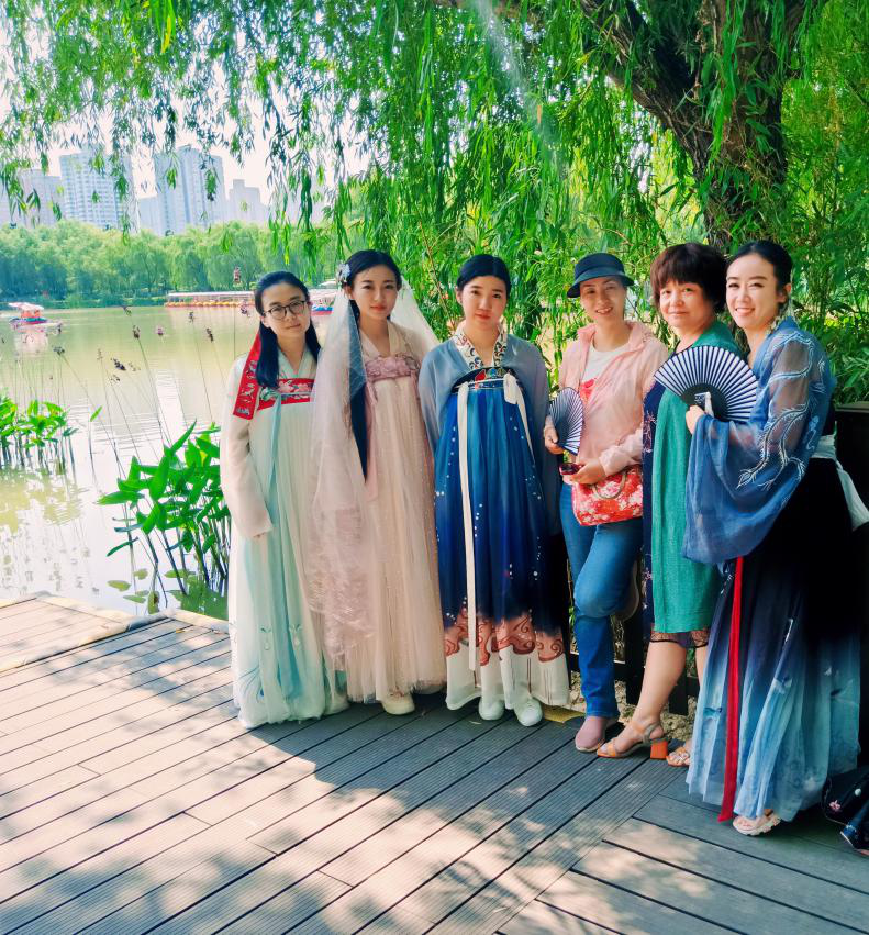 蓬莱池,又名太液池,太液池始凿于贞观八年(公元634年),龙朔二年(公元662年)时正式使用,直到唐末被废,后因历史变迁,终被淤塞和填埋为平地。太液池位于唐城内庭中心地区,是大唐王朝最重要的池苑。唐朝诗人温庭筠曾为太液池赋诗:“叠澜不定照天井,倒影荡摇晴翠长。”老师和同学们在太液池旁合照留念,身后的柳树苍翠欲滴,柳条将舒未舒。