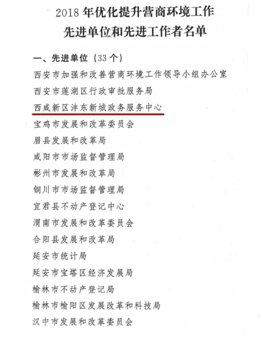 近日,省委办公厅、省政府办公厅下发《关于表彰2018年优化营商环境工作先进单位和先进工作者的通报》,西咸新区沣东新城政务服务中心荣获陕西省2018年优化提升营商环境工作“先进单位”殊荣。