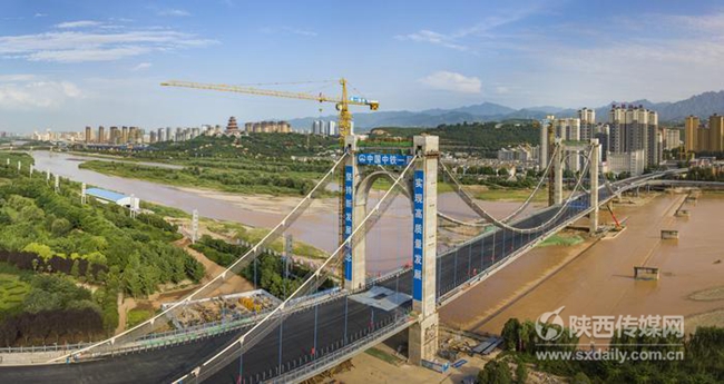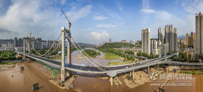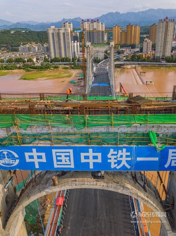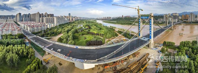 7月26日,记者用无人机拍摄下正在建设中的宝鸡联盟路渭河大桥。据了解,该桥是渭河陕西境内同类桥梁中跨径最大的悬索桥,也是西北地区首座双索面自锚式悬索桥,全长约1.4公里,桥面以上桥塔高70米,建成后将成为宝鸡市区的地标性建筑之一。截至目前,桥梁下部结构及现浇梁、钢箱梁全部完成,主塔及缆索系统浇筑完成,缆索系统吊杆索力调整已完成,现正在进行主塔装饰、主缆缠丝防腐、人行道及桥面沥青铺设,形象进度完成总工程量的95%,计划8月底完工。记者刘强 摄
