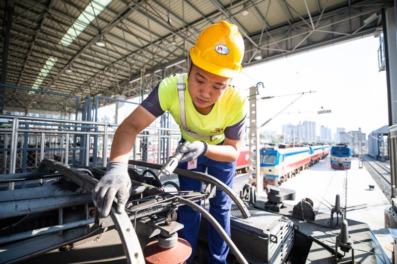 原来,随着铁路不断创新发展,2019年6月,有着85年历史的西安机务段整体搬迁至位于西安市东郊的新段址,机车整备场也从原来5条整备线增加到8条电力机车整备线和1条内燃机车整备线。新整备场上空巨大的整备棚,不但能为机车检修位置遮阳避雨,也能为夜间检修作业提供良好的全方位照明。更大的改善,是整备棚内的三层检修作业平台、门禁系统、电动高压隔离开关系统以及各类便携式检修设备的投用,不但为作业人员的人身安全提供了更加严密的保障,同时也使整备场的传统作业模式升级到信息化、自动化控制的新阶段,为后期机车整备大数据管理创造了条件。“今天是建军节,我在岗值班。以前在部队当兵,我的任务是保家卫国,现在修火车头,我的任务是守护机车和服务旅客,再苦再累也是年轻人应该干的。”于威说。(文/记者 范琼 实习生 杨霞 图/刘翔)