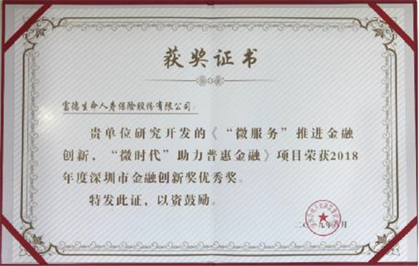 近日,由深圳市人民政府金融办组织开展的2018年度深圳金融创新奖评选工作落下帷幕。继2016年后,富德生命人寿凭借《“微服务”推进金融创新,“微时代”助力普惠金融》(以下简称“微服务”)项目,再次荣获深圳市金融创新优秀奖。据悉,同期获得优秀奖的还有招商银行、微众银行、中国平安人寿等17家公司的金融创新项目。
