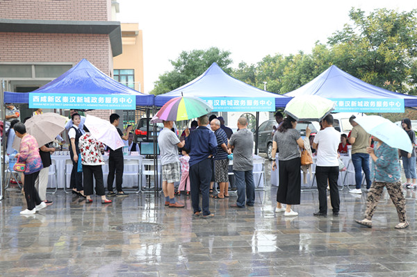 8月6日早上,西咸新区秦汉新城政务服务中心便民服务下基层、进社区活动来到了周陵街道周礼佳苑小区。活动现场,数名秦汉新城政务服务中心员工耐心细致地给现场群众介绍各项业务和办理流程。