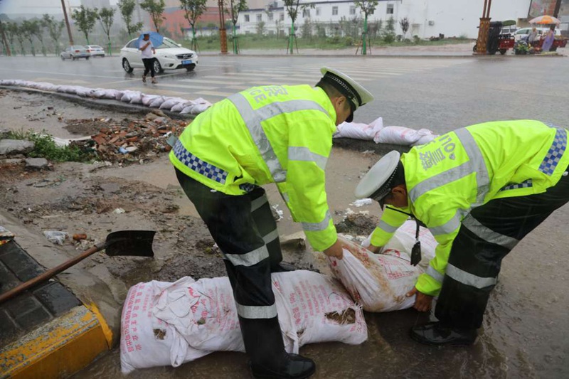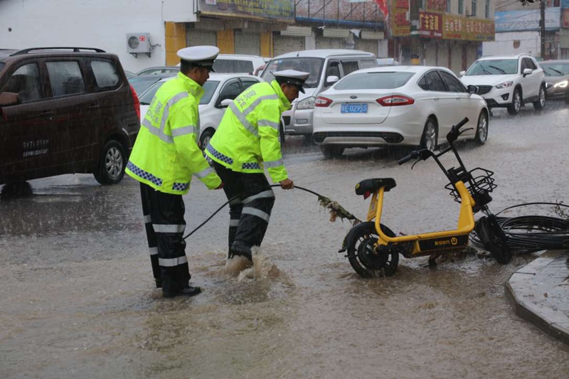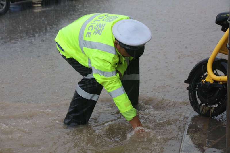 7时50分,在渭南至花园路与站北街十字路口,暴雨至路面边坡塌陷,交通信号灯被大水冲倒,交警一中队民警暴雨中用沙袋紧急排险,用手疏通管网,在暴雨中清理洪水冲下的杂物,感人至深,过往市民为之动容。据了解,当日仅临渭交警出动警力500人次,车辆100多台次,疏通堵点80多处,施救车辆30多台。