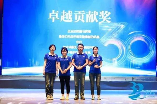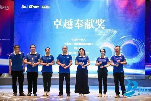 三十华诞,庆典大会表彰了入职二十年、十五年以及累计获得五次以上年度优秀员工,并邀请蓝溪控股董事长王武、副董事长常春、总经理胡锦秀分别向优秀代表颁发了“卓越贡献奖”、“卓越奉献奖、“卓越功勋奖”奖杯,他们见证了蓝溪的成长与发展,他们坚守岗位、脚踏实地,为企业的蓬勃发展默默地发挥着自己的光和热。