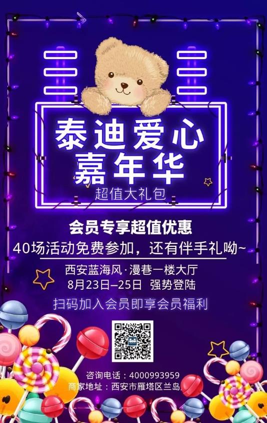 在官微评论区留言,说说你“跟泰迪熊的小故事”,就有机会获得本场嘉年华入场券(一大一小通票),幸运的还能免费获得“泰迪爱心成长年卡”一张,持卡可免费参加泰迪文创学院全年40场活动哦。