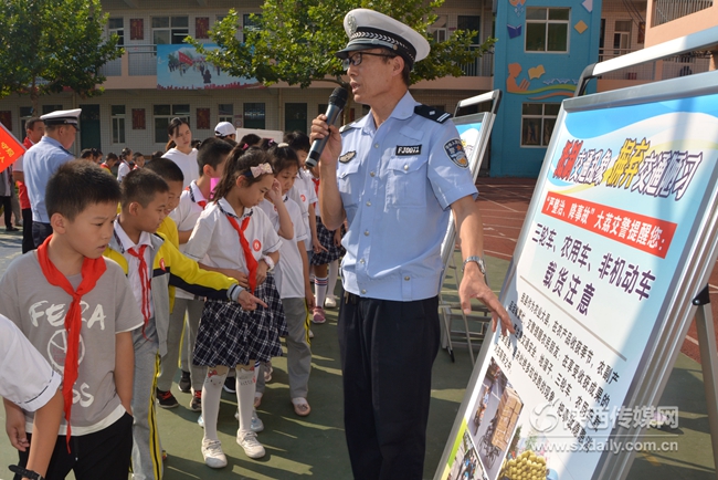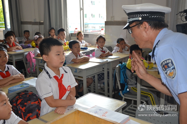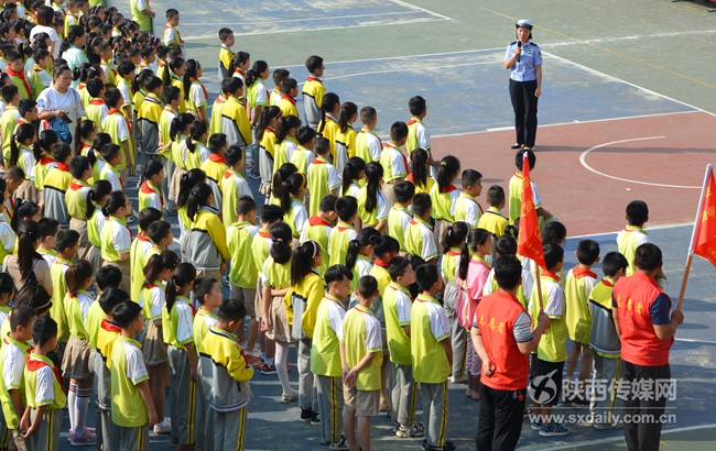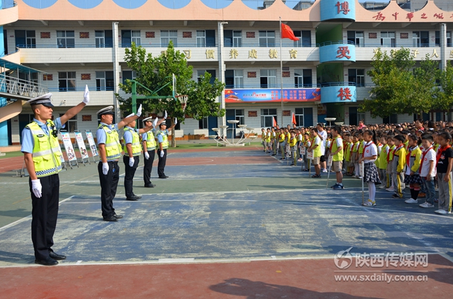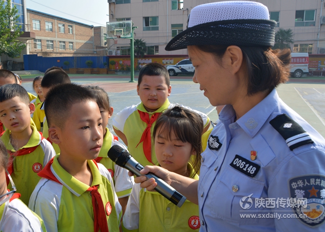9月3日,大荔县仁厚里小学,民警为小学生做指挥手势展示。