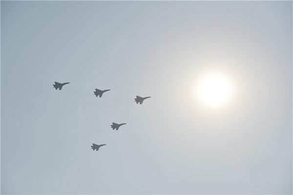 10月1日上午,庆祝中华人民共和国成立70周年大会在北京天安门广场隆重举行。 这是受阅的歼击机梯队。 新华社记者魏培全摄